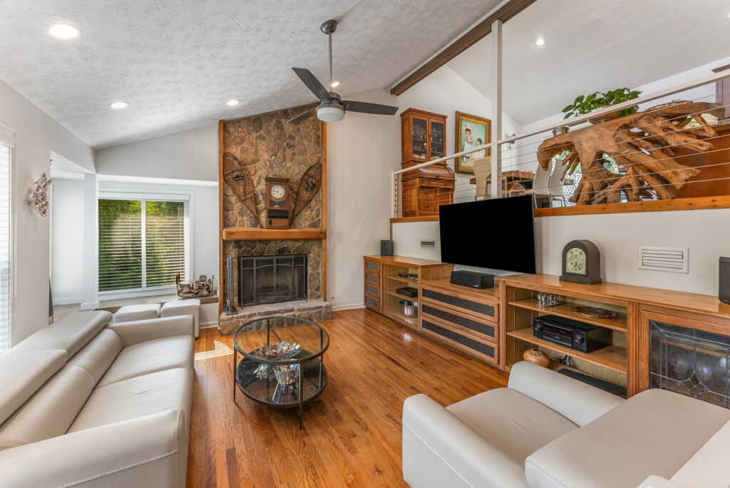 Its open, split-level design allows natural light to flow throughout the home, creating bright, airy spaces from front to back. Upstairs, the vaulted dining room and updated kitchen overlook the living room with clerestory windows and sliding doors that lead to the back deck.