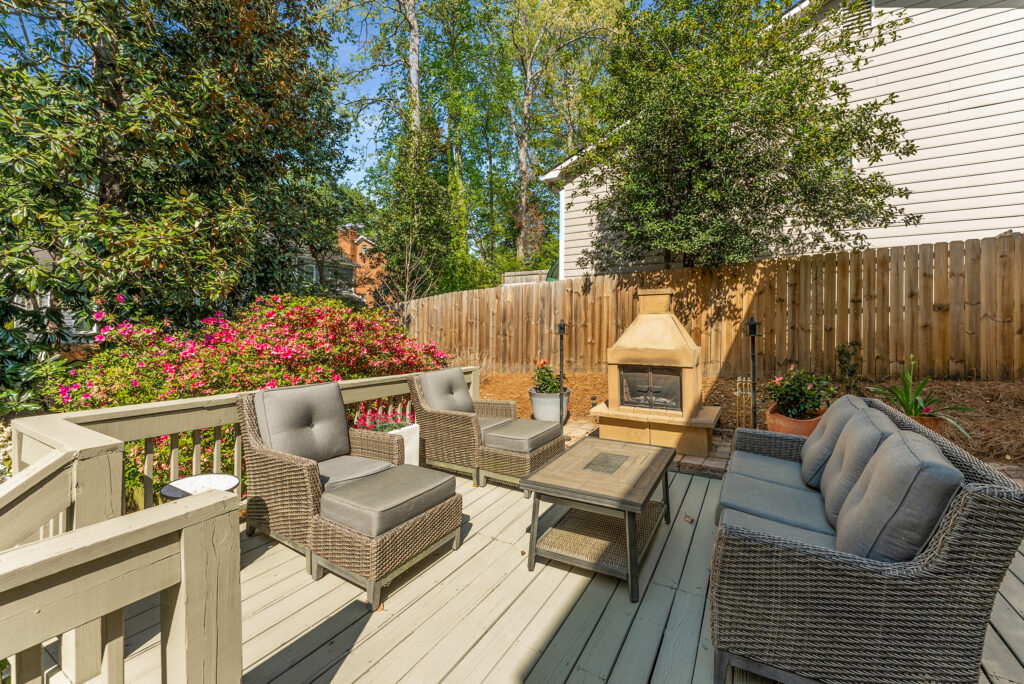The expansive lower-level deck also includes a sitting area with an outdoor fireplace and stairs connecting to the upper deck. The fenced backyard provides a grassy play area, colorful azaleas and a charming porch swing.