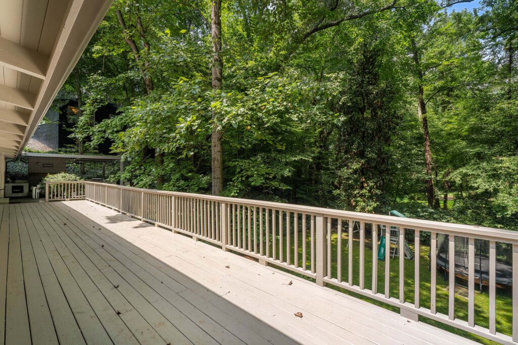 A spacious deck spans the length of the home and connects to a covered outdoor kitchen equipped with a built-in grill, fireplace, a Green Egg shelf and an aluminum louver system with a rain sensor, creating a versatile setting for year-round enjoyment.