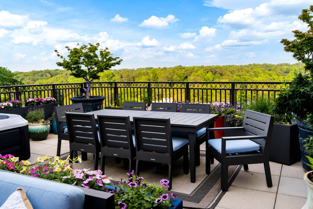 Two private terraces extend the living area outdoors, featuring a tranquil water feature and a relaxing hot tub, ideal for entertaining or unwinding while enjoying panoramic skyline views of Atlanta.